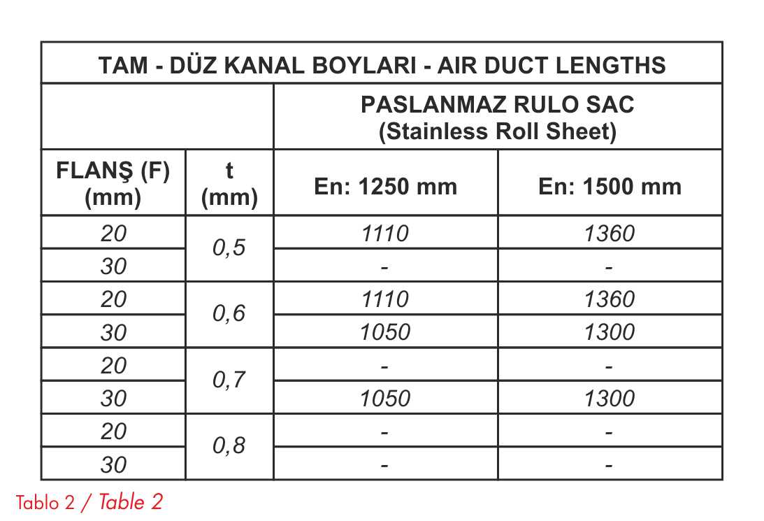 Full duct lengths vary due to the special flange cross section. These details are given in Table-1 and Table-2.