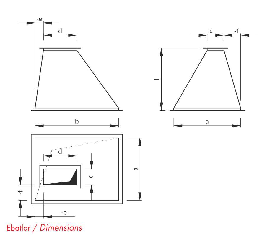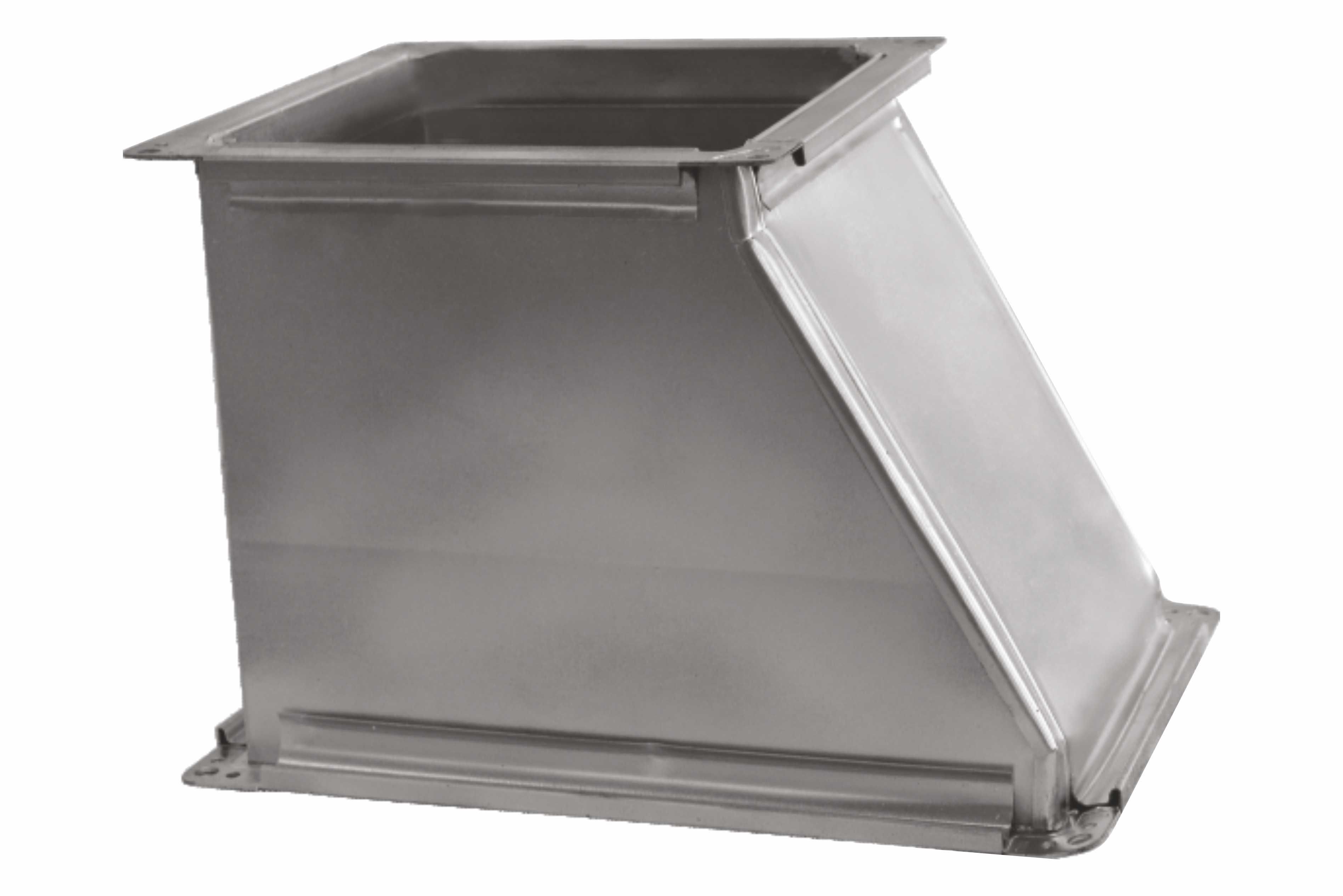 Açıklama: Redüktör farklı ebatlardaki iki tane dikdörtgen boruyu birleştirmek amacıyla kullanılmaktadır. Uçlarında metal levhalı bağlantı profili montaj çerçeveleri mevcut olup, çapraz levha ondülasyon yöntemiyle güçlendirilmiştir. Kesinti eşmerkezli bir şekilde indirgeyerek bir havalandırma sisteminin tasarlanmasını sağlar. Her iki ebadın eksenleri birbirleriyle uyumludur.
