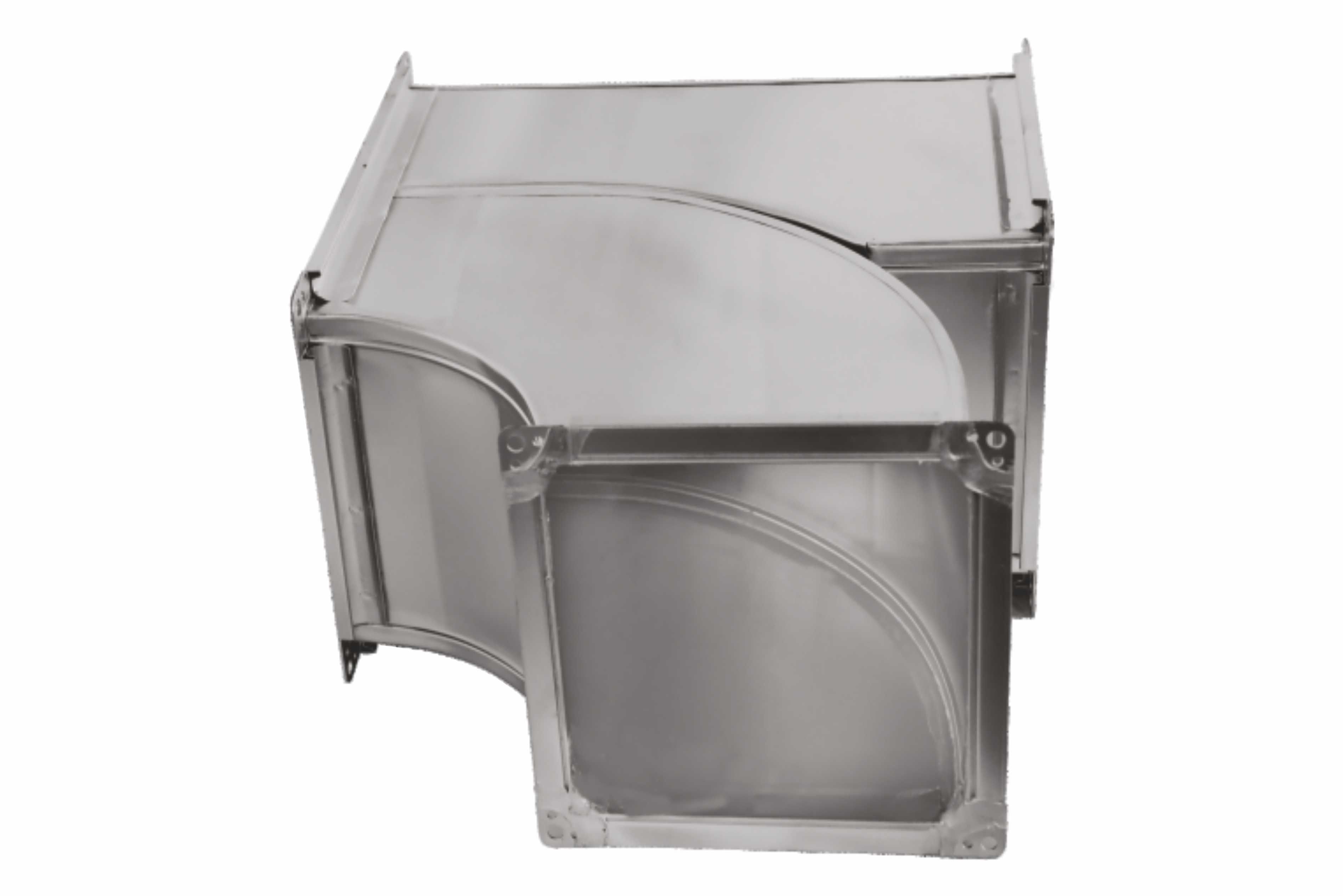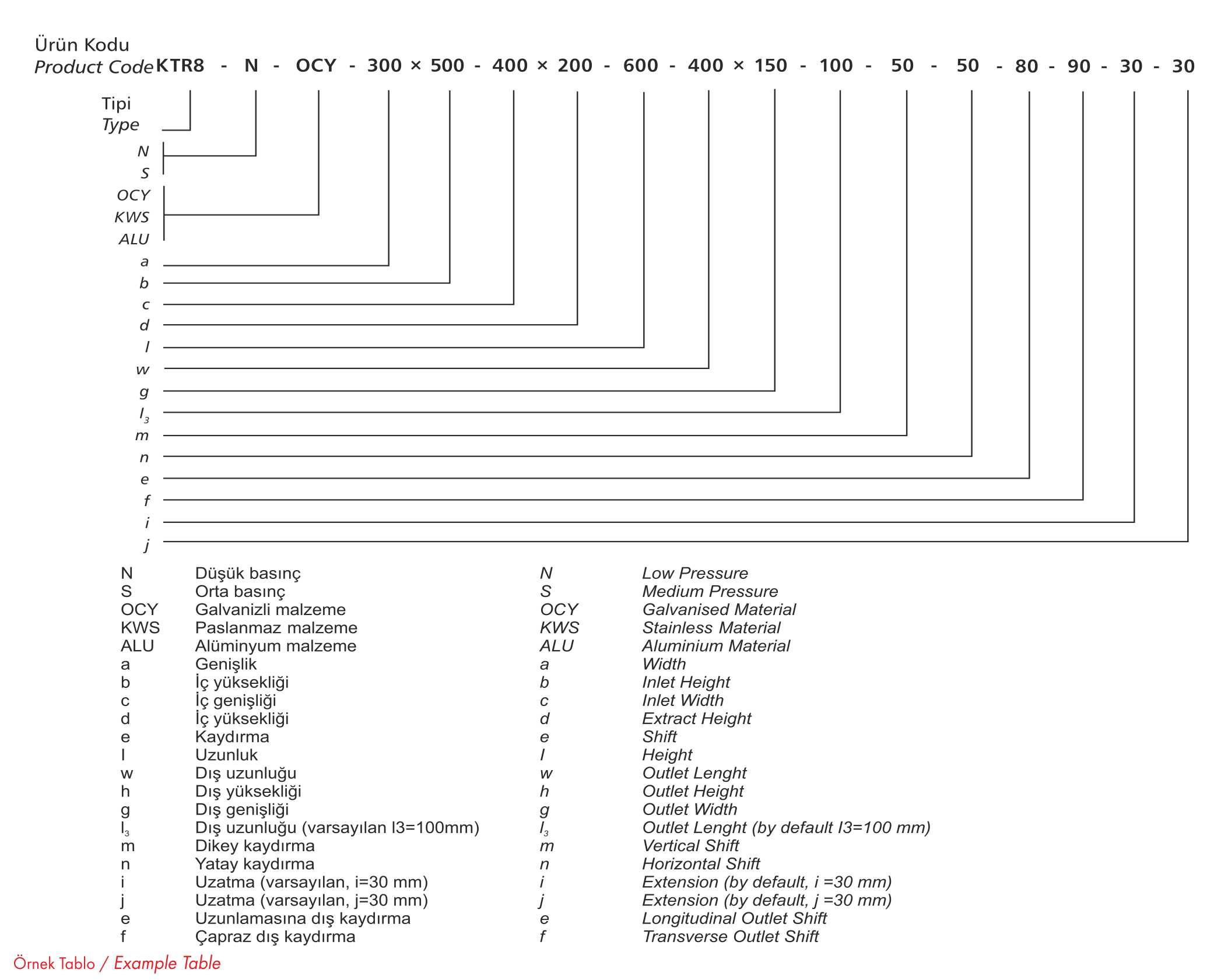 Açıklama: T – parçasının uçlarında levha metal bağlantı profili montaj çerçeveleri mevcut olup, çapraz levha ondülasyon yöntemiyle sertleştirilmiştir. T parçası sayesinde 90° bir açıyla, bir havalandırma sistemi ve herhangi bir m değeriyle çıkışı daha kısa olan bir çıkış redüksiyonu tasarlanabilir. Ek olarak çıkış T parçasınınkinden daha farklı bir yüksekliğe sahip olabilir.