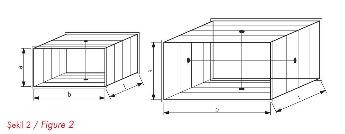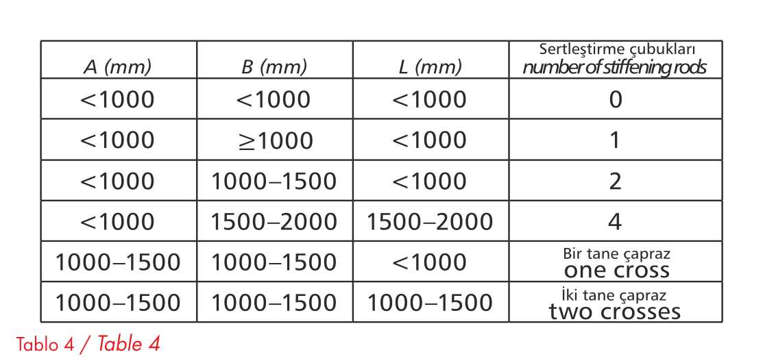 Diktörtgen borular ve bağlantı parçaları metal levhalarının çapraz ondülasyonu aracılığıya daha da sert bir hale getirilir. Ek olarak, borulara şekil 2’de gösterildiği gibi galvanizli sertleştirme çubuklarıyla sertleştirilir. Havalandırma borularının sertlik derecesinin nasıl artırılacağı tablo 4’de gösterilmiştir.