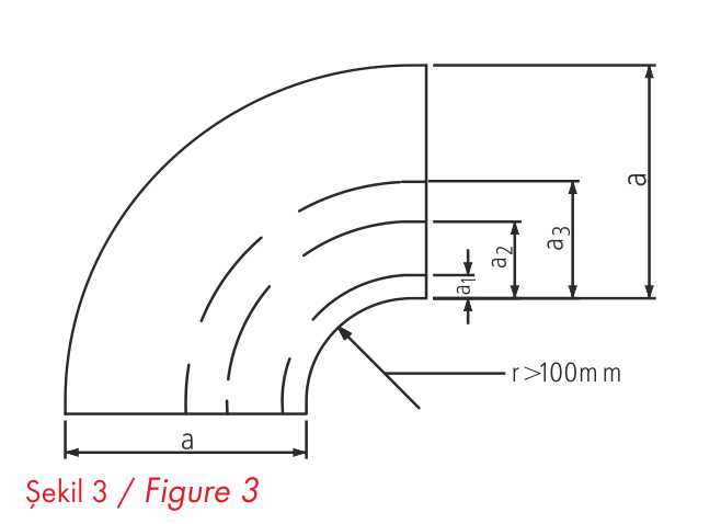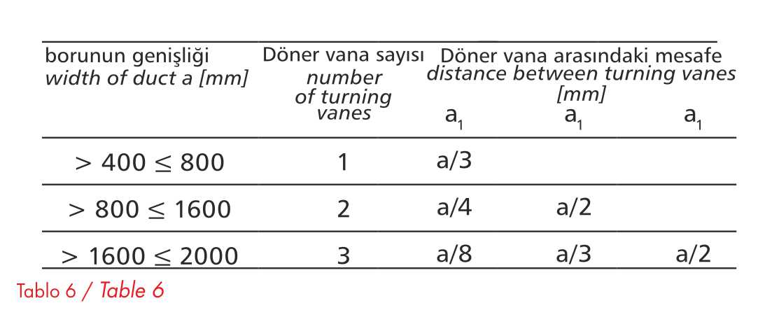 Büküm yerleri döner vanalarda PNEN 1505 standardına (Düz Dikdörtgen Metal Levhalı Havalandırma Boruları ve Bağlantı Parçaları) belirtildiği gibi sertleştirmektedirler. Büküm yerleri (dirsekler) düşük akış oranlara /basınçlara ve daha küçük taraf uzunluklarına < 400mm sahip olan sistemler için önerilmektedir. Döner vanalar açısı <45° şeklindeki dirsekler için gerekli değildir. Döner vanaların nasıl ayarlanacağı tablo 5 ve şekil 3’te gösterilmiştir.